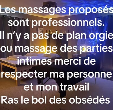 LES MASSAGES SONT STRICTEMENT PROFESSIONNELS, TOUTE PERSONNE QUI SUGGÈRE OU DEMANDE DES GESTES INTIMES SERA BLOQUÉE ET SIGNALÉE AUX AUTORITÉS